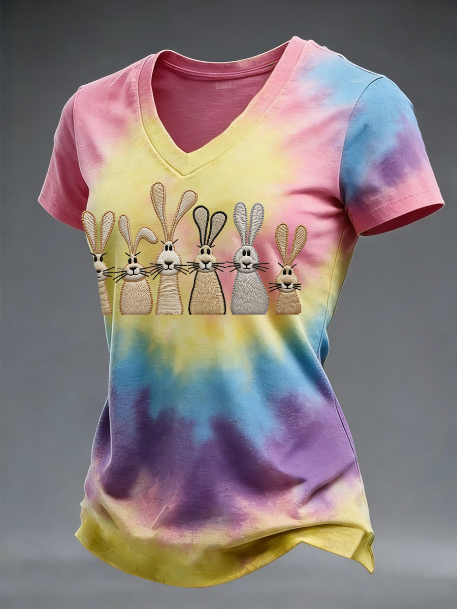 Women's Easter Cute Bunny Tie-Dye Print Casual V-Neck Tee