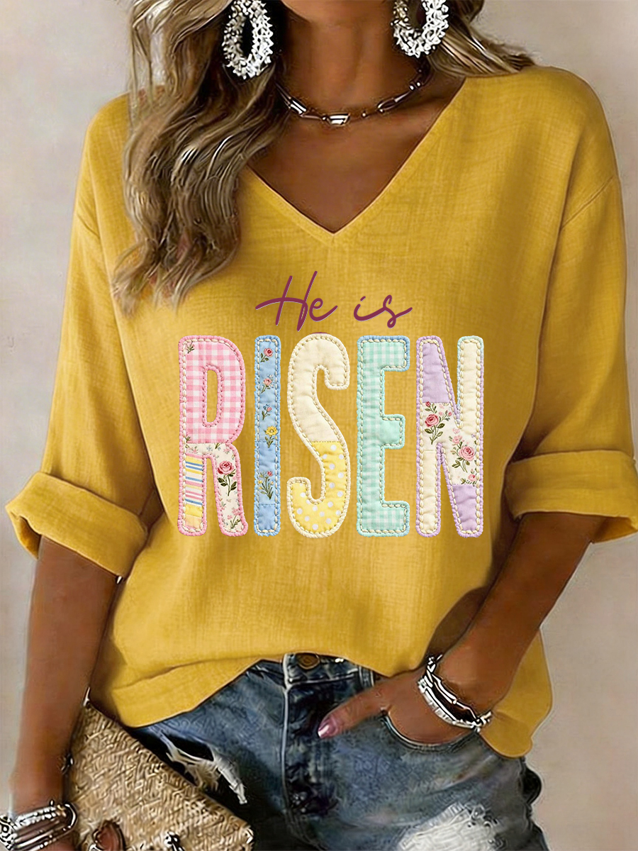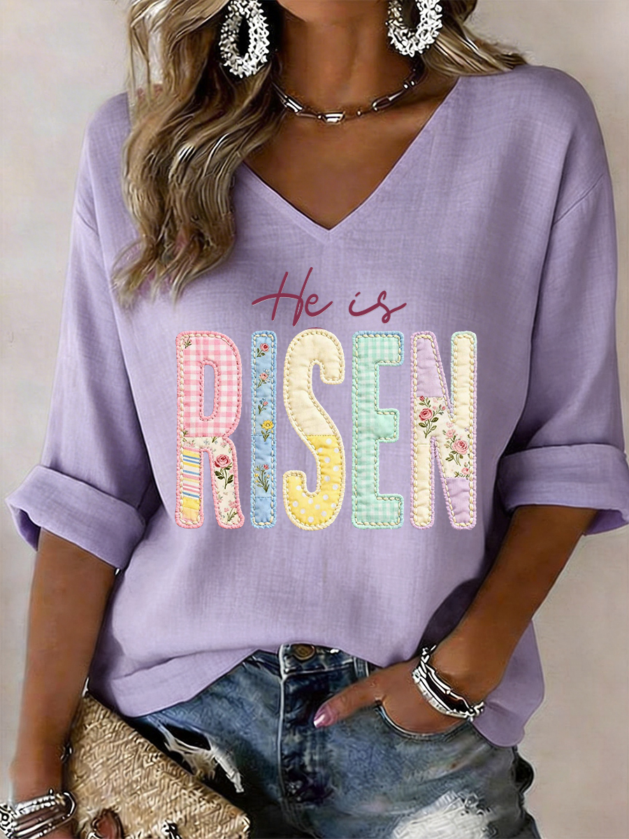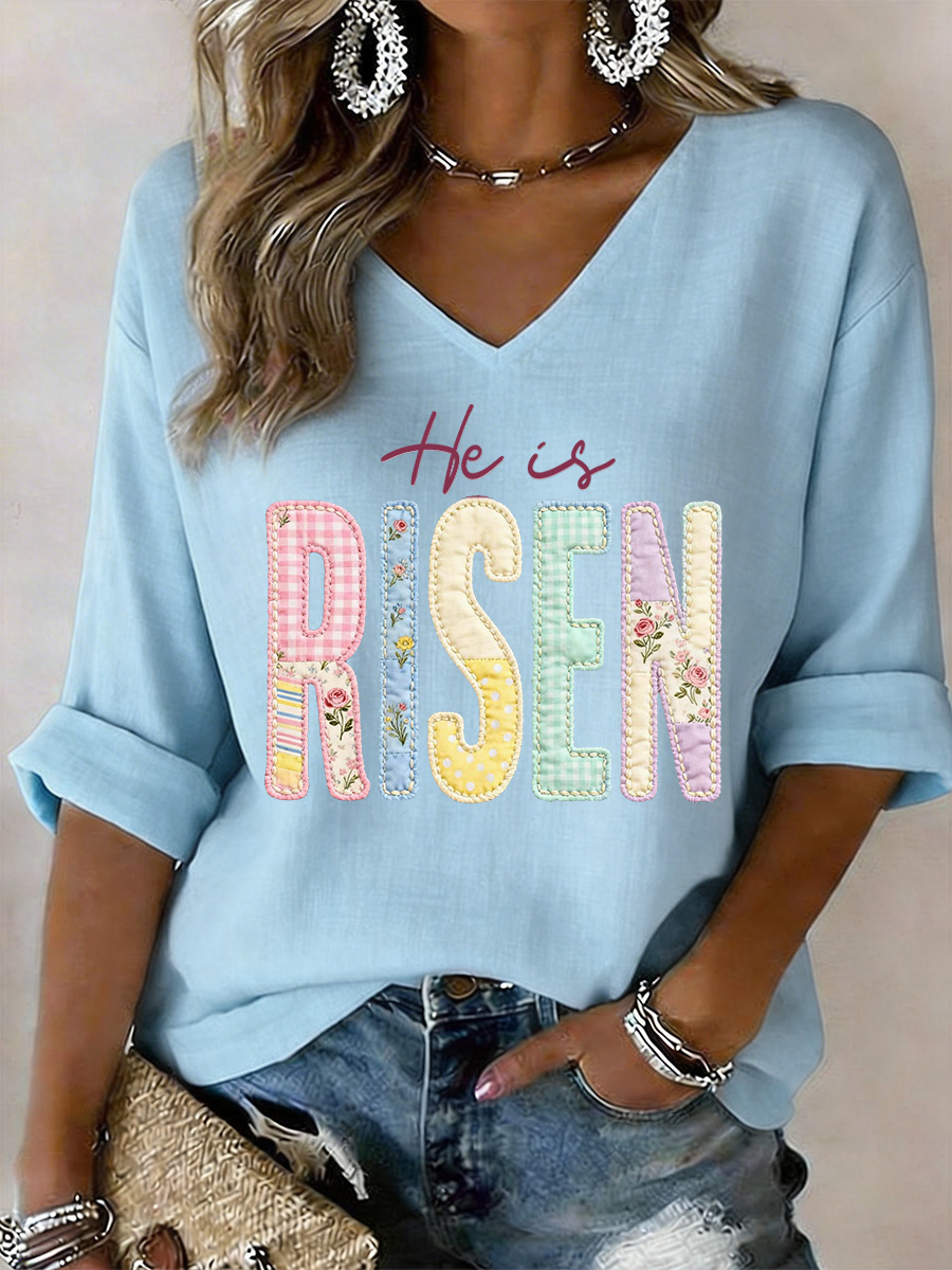 Women's He Is Risen Jesus Christian Cross Print Casual V-Neck Long-Sleeve T-Shirt
