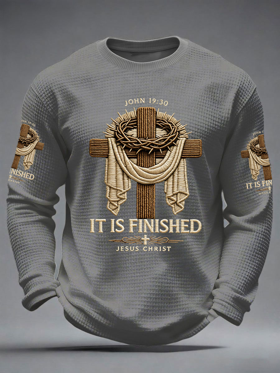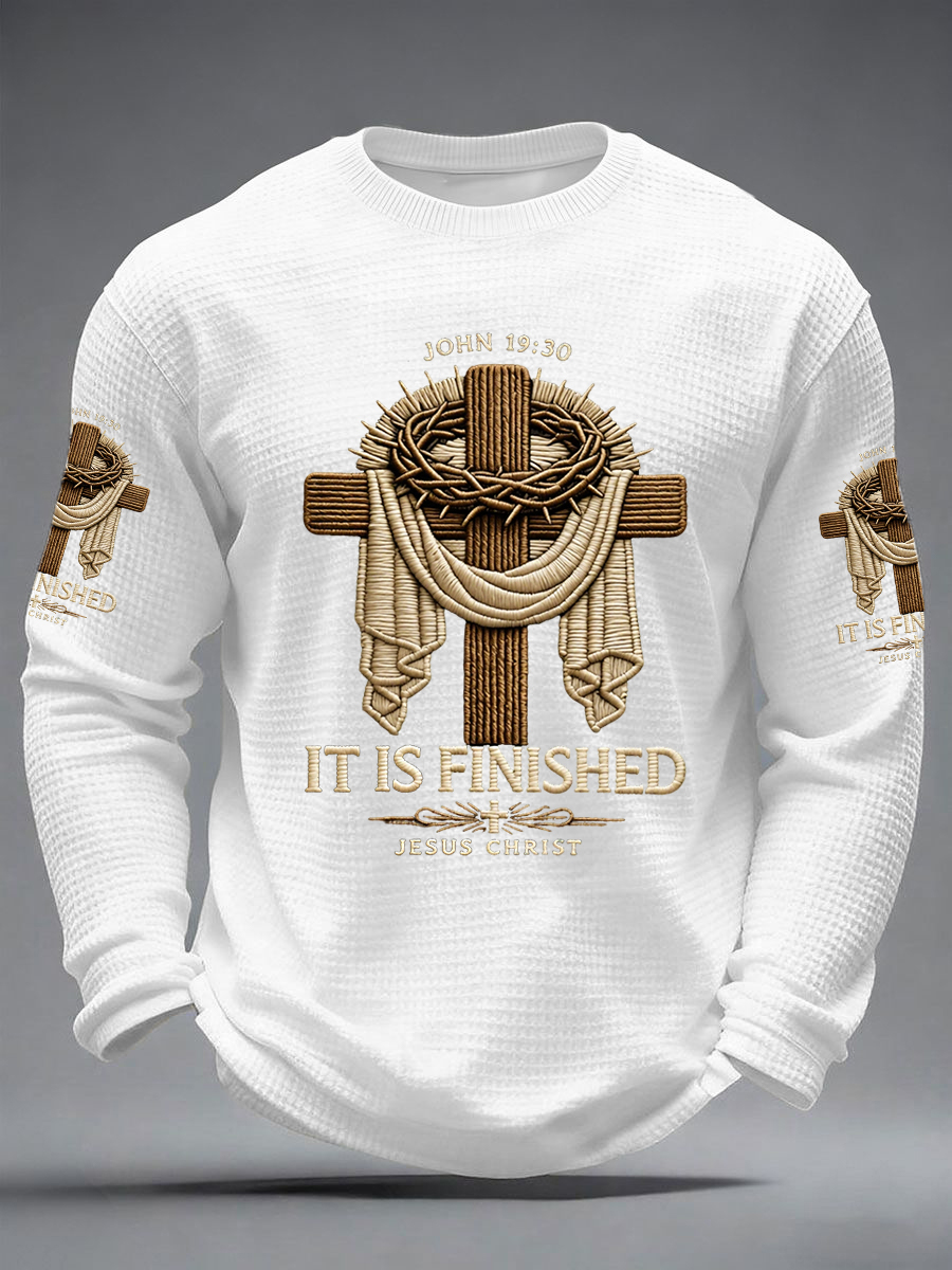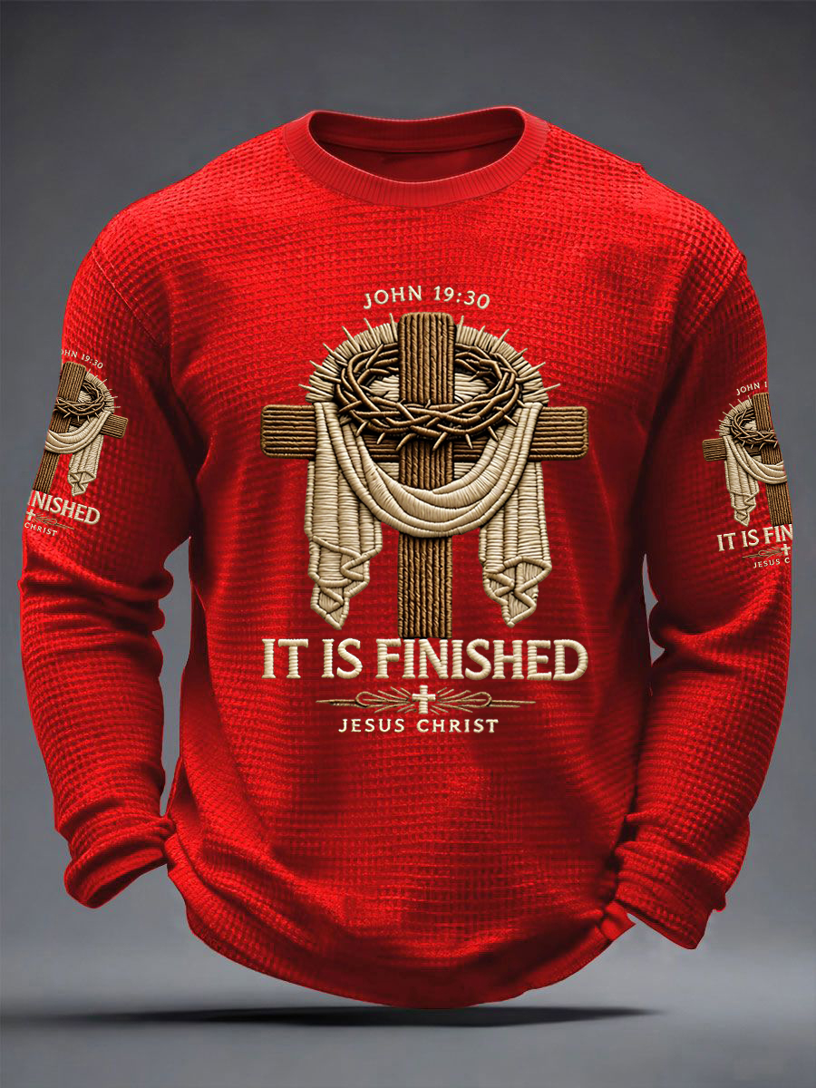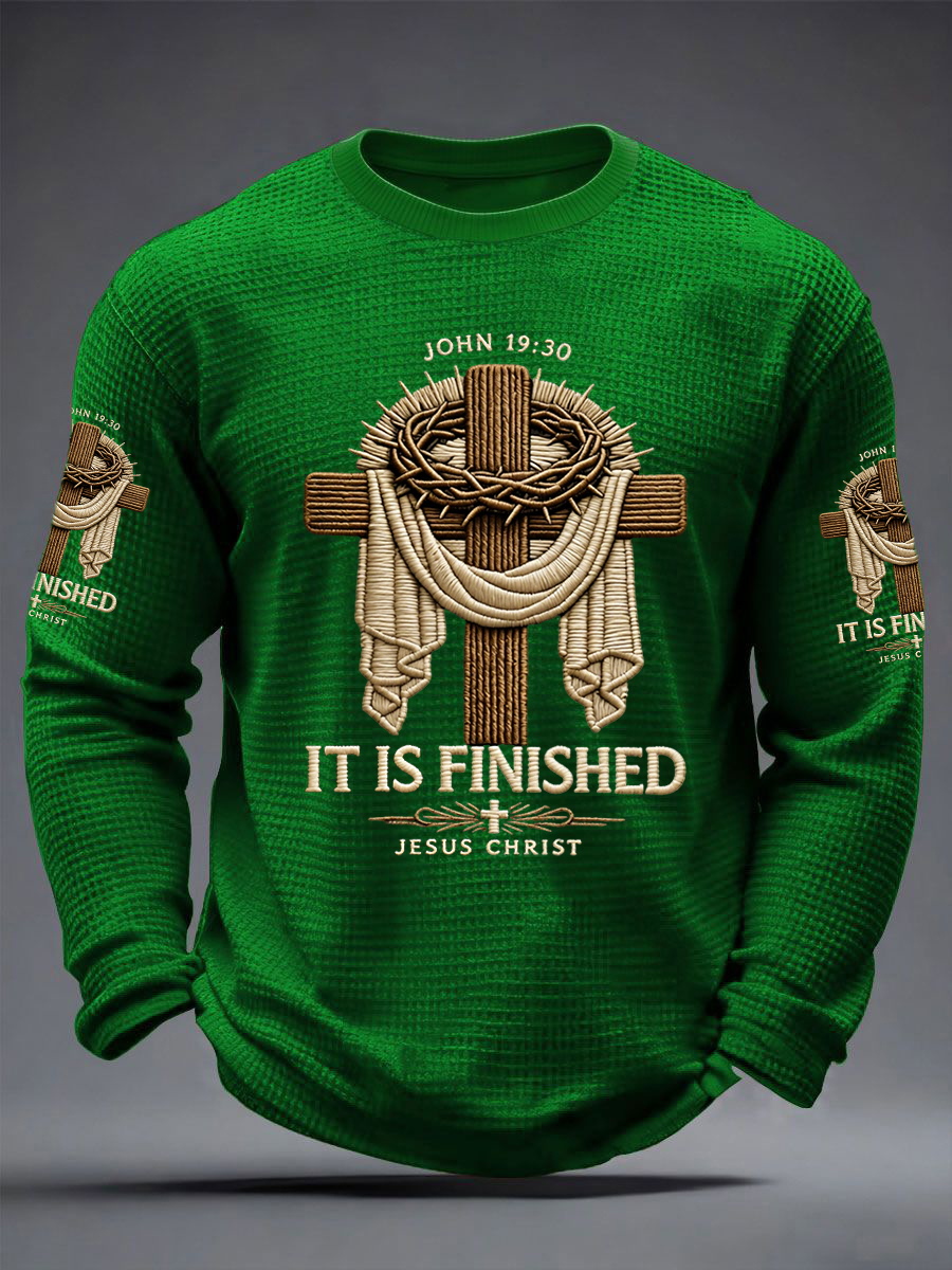 Men's He Is Risen It’s Finished Easter Jesus Christian Cross Print Casual Waffle Long Sleeve T-Shirt