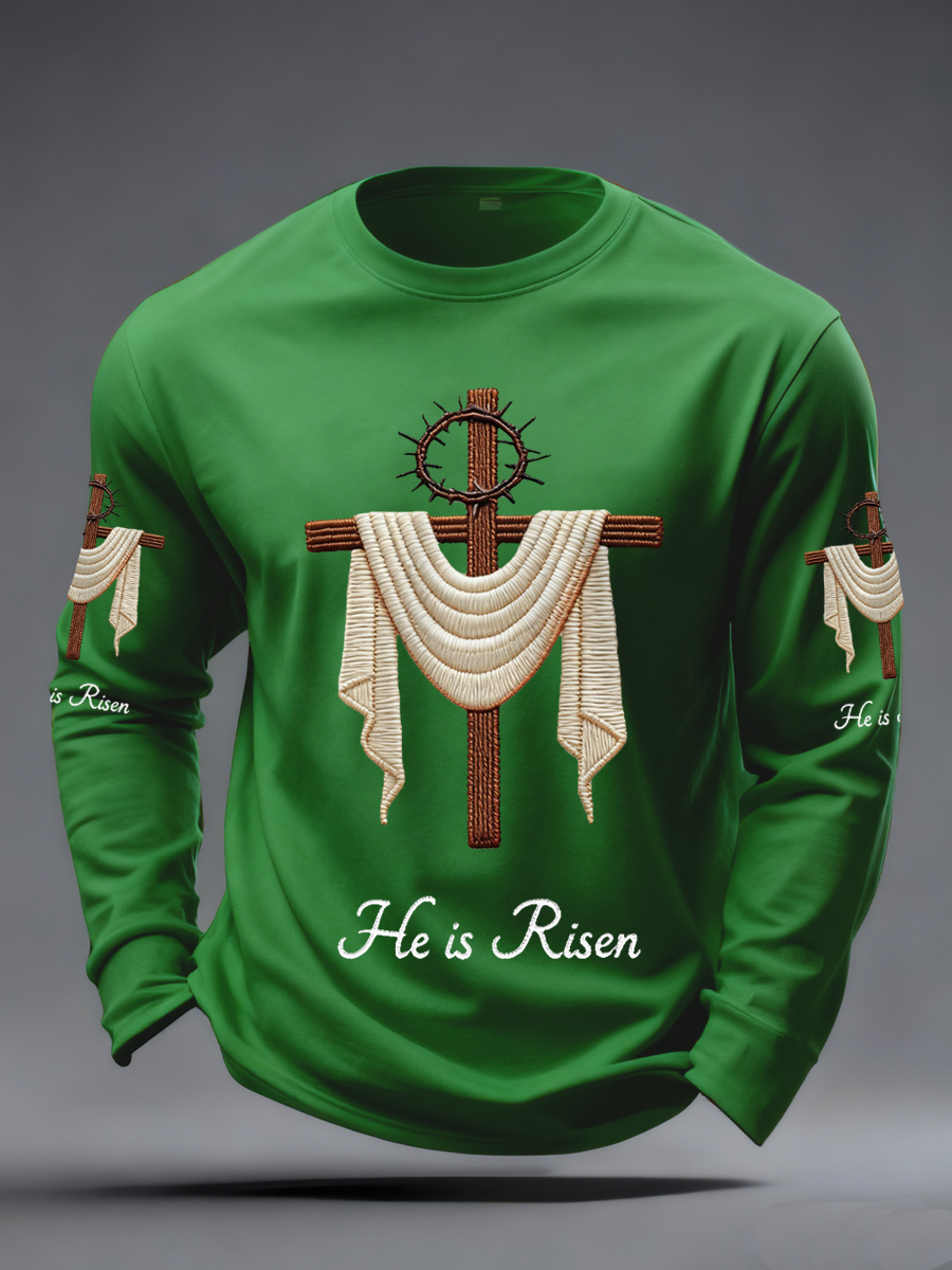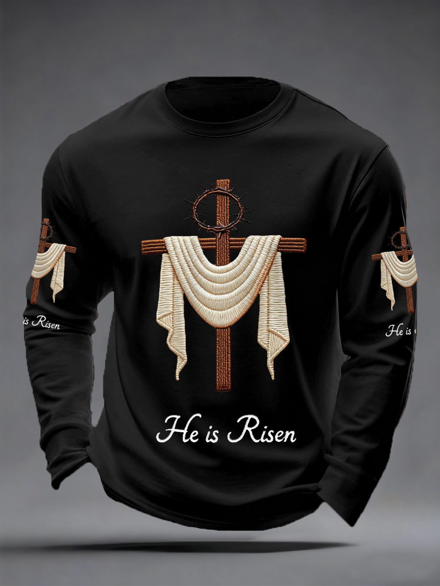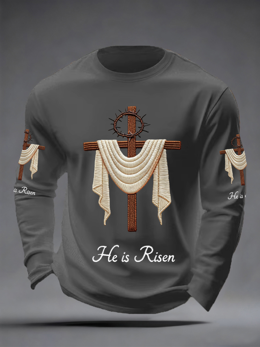Men's He Is Risen Jesus Christian Cross Print Casual Long Sleeve T-Shirt