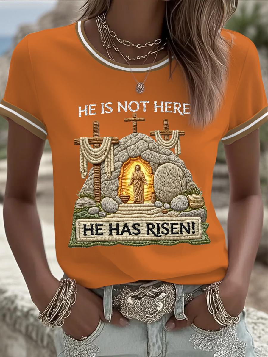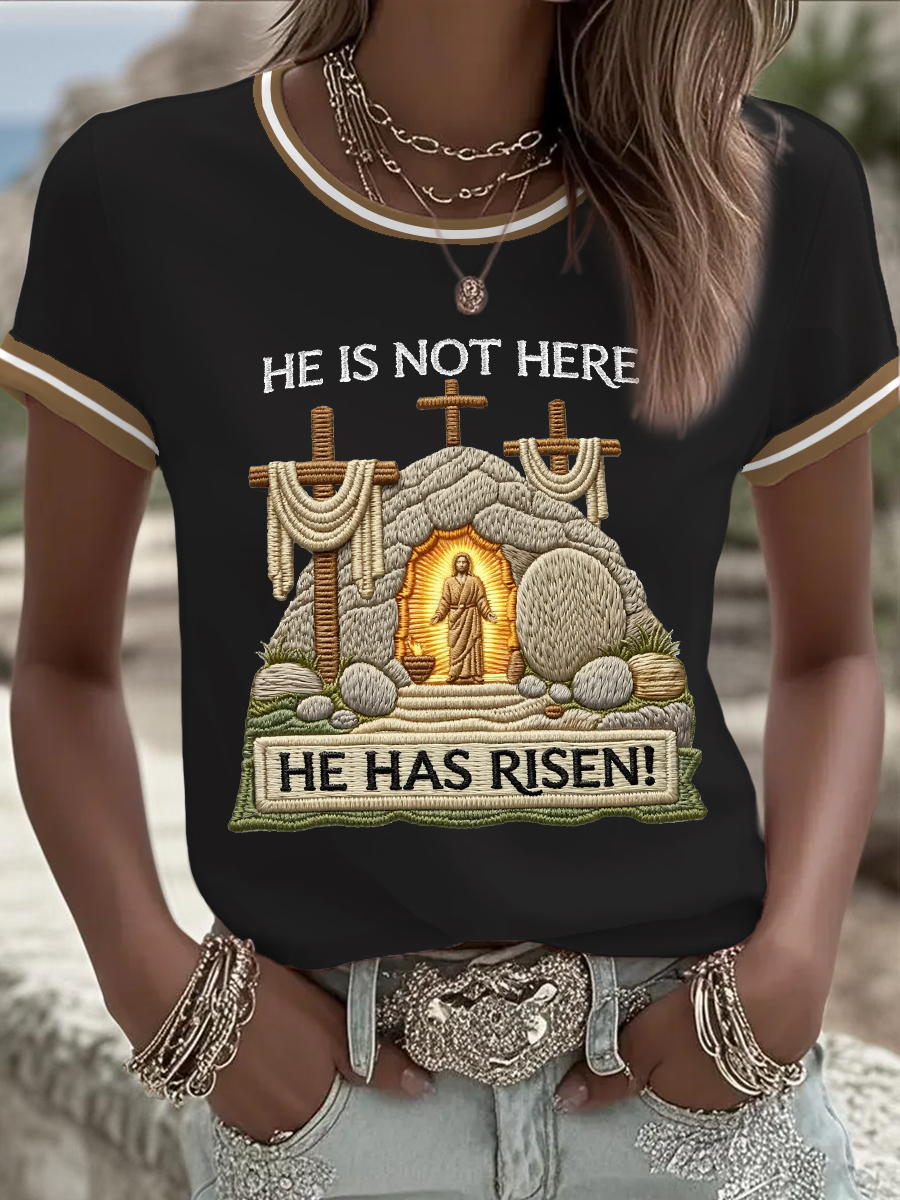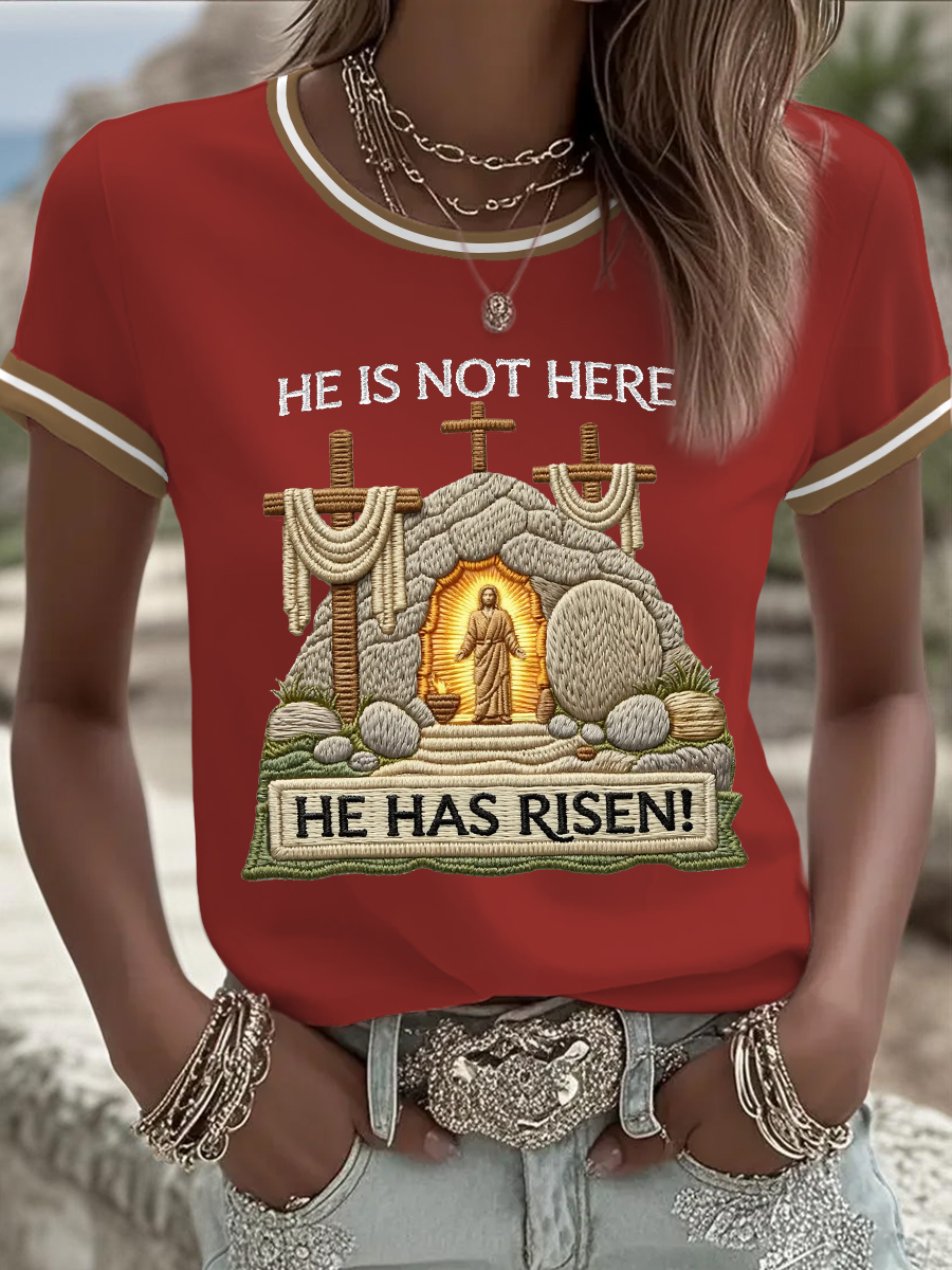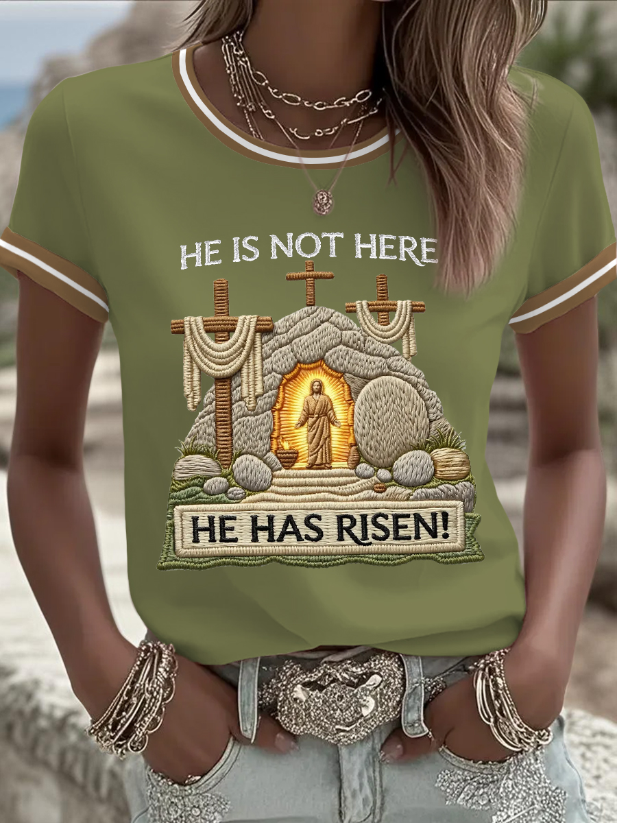 Women's He Is Not Here He Has Risen! Jesus Christian Cross Print Casual Tee