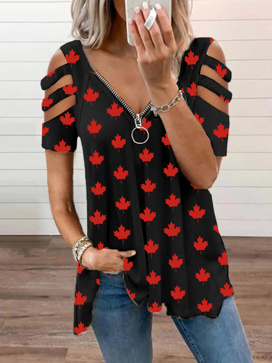 Women's Canadian Maple Leaf Print Casual V-Neck Zipper Top