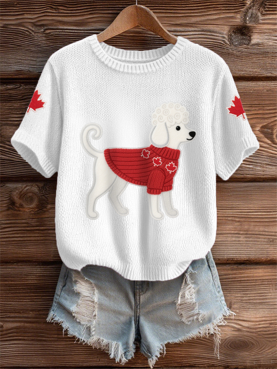 Women's Cute Dog Canadian Maple Leaf Print Casual Tee